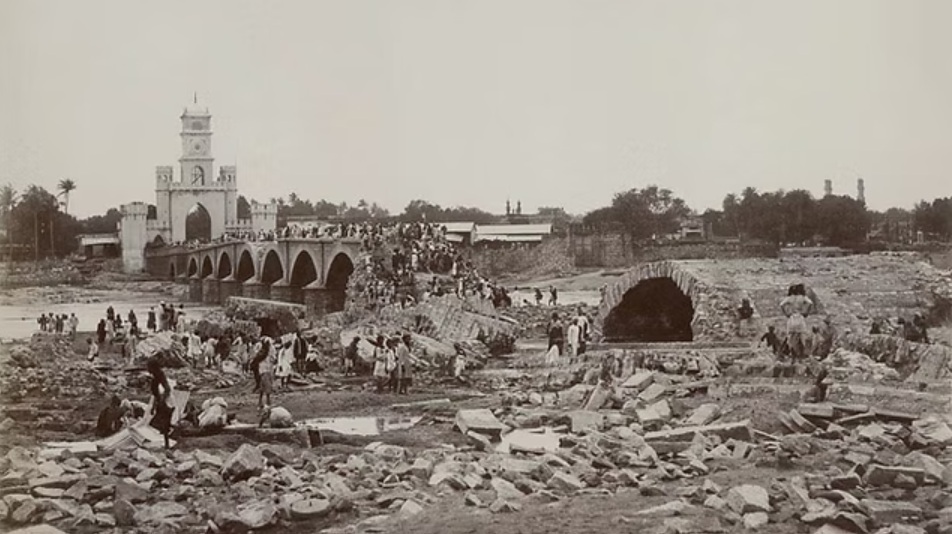 Around 15,000 lives were lost. Nearly 19,000 houses collapsed. Roughly one lakh people, a quarter of Hyderabad’s population then, were left without shelter. Three bridges were washed away completely: the Afzal, the Mussallam Jung, and the Chaderghat. Only Puranapul remained standing as the sole physical link between the two halves of the city.