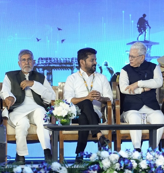 Then came Nobel laureate Kailash Satyarthi, who asked the room for something gentler: compassion. Compassion in economics, in politics, in how we see one another. He praised Telangana’s reforms including farm loan waivers, free travel for women, stronger healthcare and education, and reminded everyone that development without empathy is merely construction.
